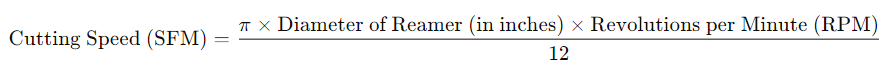 A velocidade de corte, ou velocidade de superfície, refere-se à velocidade com que a aresta de corte do alargador se move através da peça de trabalho. Normalmente é medido em pés superficiais por minuto (SFM) ou metros por minuto (m/min). Para calcular a velocidade de corte adequada para um alargador, use a seguinte fórmula: