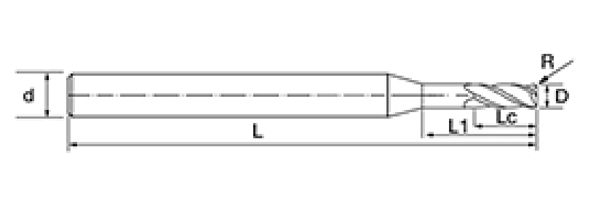 | Não. | Diâmetro D | Ângulo R R | Comprimento da Flauta euc | Comprimento Efetivo L1 | Comprimento total L | Diâmetro da haste d | Contagem de lâminas F |