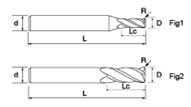 | Série de ferramentas | Diâmetro | Raio | Raio de canto | Comprimento da Flauta | Comprimento Efetivo | Comprimento total | Diâmetro da haste | |||