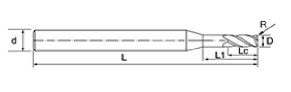 | Não. | Diâmetro D | Ângulo R R | Comprimento da Flauta euc | Comprimento Efetivo L1 | Comprimento total L | Diâmetro da haste d | Contagem de lâminas F |