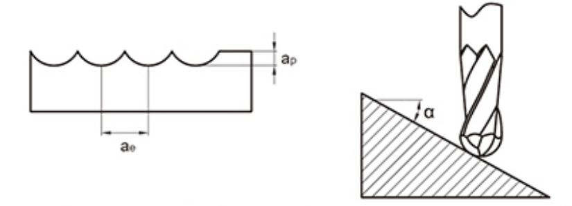 | Raio da cabeça esférica (mm) | Velocidade rotacional (mínimo -1 ) | Velocidade de alimentação (mm/min) | a p (mm) | a e (mm) | Velocidade rotacional (mínimo -1 ) | Velocidade de alimentação (mm/min) | a p (mm) | a e (mm) | Velocidade rotacional (mínimo -1 ) | Velocidade de alimentação (mm/min) | a p (mm) | a e (mm) |