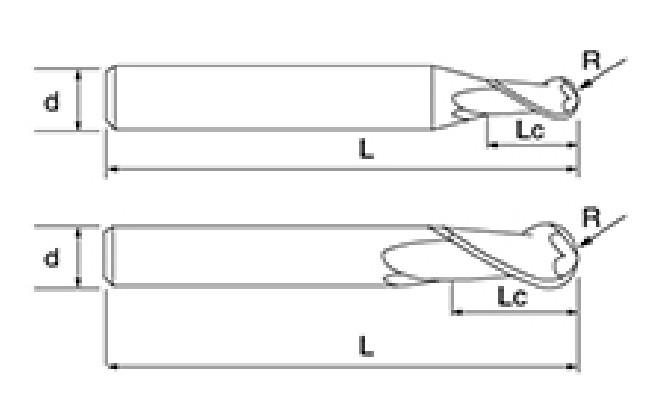 | Série de ferramentas | Diâmetro | Raio | Raio de canto | Comprimento da flauta | Comprimento efetivo | Comprimento total | Diâmetro da haste | |||