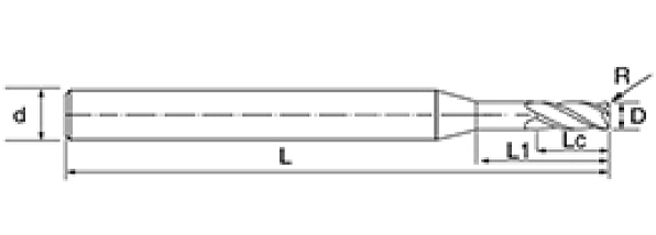 | Não. | Diâmetro D | Ângulo R R | Comprimento da Flauta euc | Comprimento Efetivo L1 | Comprimento total L | Diâmetro da haste d | Contagem de lâminas F |