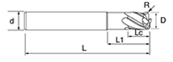 | Não. | Diâmetro D | Ângulo R R | Comprimento da Flauta euc | Comprimento Efetivo L1 | Comprimento total L | Diâmetro da haste d | Contagem de lâminas F |