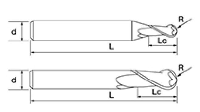| Série de ferramentas | Diâmetro | Raio | Raio de canto | Comprimento da flauta | Comprimento efetivo | Comprimento total | Diâmetro da haste | |||