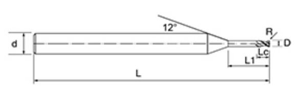 | Não. | Diâmetro D | Ângulo R R | Comprimento da Flauta euc | Comprimento Efetivo L1 | Comprimento total L | Diâmetro da haste d | Contagem de lâminas F |