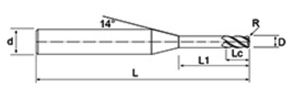 | Não. | Diâmetro D | Ângulo R R | Comprimento da Flauta euc | Comprimento Efetivo L1 | Comprimento total L | Diâmetro da haste d | Contagem de lâminas F |