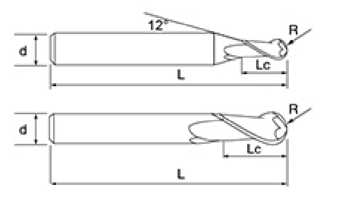| Não. | Diâmetro D | Ângulo R R | Comprimento da Flauta euc | Comprimento total L | Diâmetro da haste d | Contagem de lâminas F |